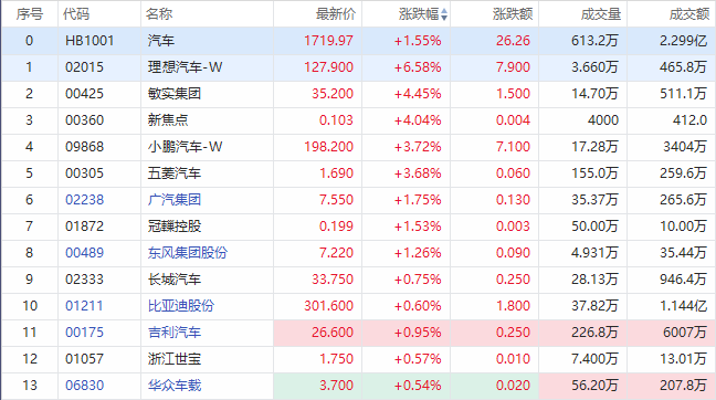 华盛资讯11月17日消息,港股汽车股早盘拉升上涨,截至发稿,理想汽车涨近7%;敏实集团、新焦点涨超4%;小鹏汽车、五菱汽车涨超3%;广汽集团、东风集团股份涨超1%;长城汽车、比亚迪股份、吉利汽车微涨。
