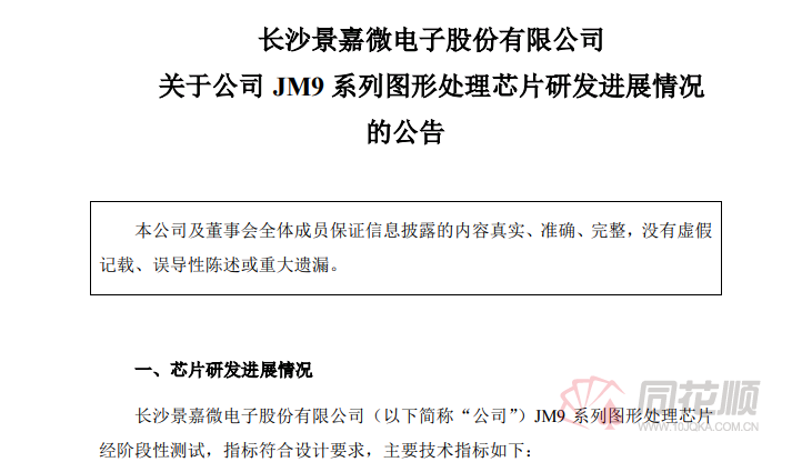 据查,JM9系列图形处理芯片是公司2018年非公开发行股票募投项目之一。公告显示,JM9系列图形处理芯片是超大规模的集成电路产品,其功能、性能测试极为复杂,目前已完成基本的功能测试。