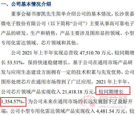 其实之前接受调研机构时,景嘉微就表示,芯片领域是公司大力发展的业务方向,基于公司多年来在通用领域的产片开发与市场拓展,公司芯片产品在通用领域的应用得到大幅提升,使得收入大幅增加,而2021年上半年公司芯片领域收入为2.14亿元,较同期增长1354.57%。
