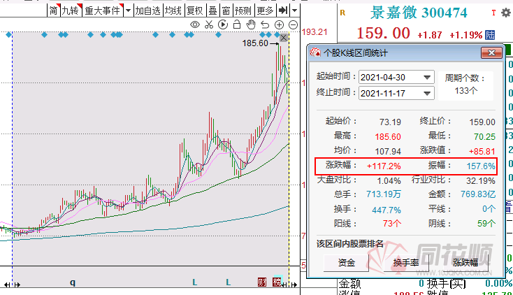 尽管如此,仍然难挡景嘉微的涨势,今年以来,景嘉微从70元涨至最高185.6元,涨幅一度超过150%,可以说是芯片牛股之一。