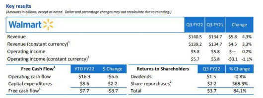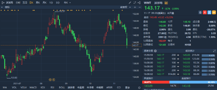11月16日盘后,沃尔玛公布截至2022财年Q3业绩。财报显示,沃尔玛在第三财季营收同比增 4.3% 至 1405 亿美元,好于预期的1356亿美元;调整后每股收益 EPS 为 1.45 美元,同比增 8.2%,好于预期的1.40美元。此外,该季度沃尔玛旗下山姆会员店的销售额增长了13.9%,两年累计增长25%。会员收入增长11.3%,这是连续第五个季度两位数的增长。