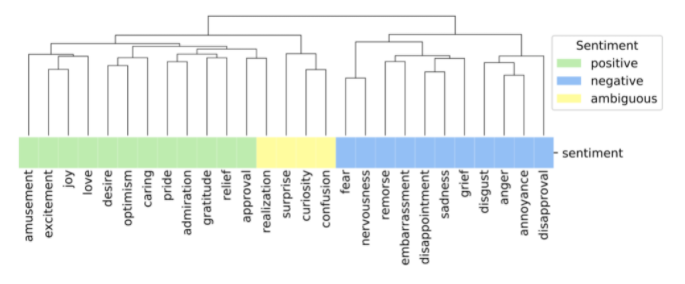 研究结果发现,尽管GoEmotion 分类法中没有预先定义情感(sentiment)的概念,但在情感(消极、积极和模棱两可)方面相关的情绪能够聚合在一起,表明了rater 的数据标注质量很高,和数据标注的一致性。