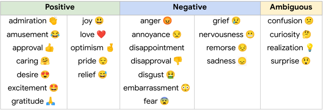 Google 最近就带来了一个全新的情绪数据集GoEmotion,包含了58000个人工标注的Reddit 评论,并且将情绪分为28个类别。作为迄今为止标注最详细的英语情感数据集,Google从心理学和数据适用性上设计了一个GoEmotion情感分类法。