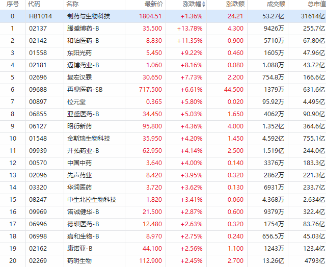 华盛资讯11月17日消息,港股制药与生物科技股普涨,腾盛博药-B尾盘再度走强,现涨13.78%,本周已累涨超60%;和铂医药涨11.35%至8.83港元,盘中股价创8月初以来新高;东阳光药涨9.22%;再鼎医药涨6.61%;先声药业、昭衍新药、开拓药业涨超4%。