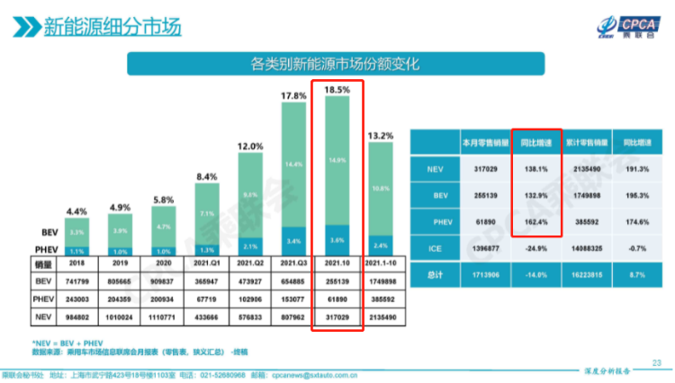 而在全球最大的汽车市场——中国,新能源车发展速度更为迅速。据乘联会的数据显示,10月中国新能源车产销再创历史新高,分别达到39.7万辆和38.3万辆,同比增幅均超130%,渗透率达到18.5%。