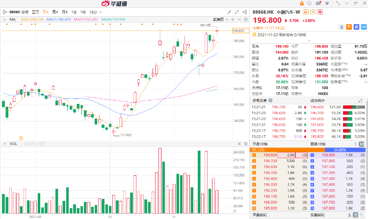 花旗银行此前发布研究报告称,小鹏汽车在先进驾驶辅助系统方面具有明显的竞争优势,预计2021-2023年汽车销量将达到9.4万辆、16万辆和24万辆。花旗大幅调高了小鹏汽车港股目标价,由207.5港元上升至338港元,截止发稿,小鹏汽车港股报196.8港元,意味着70%以上的上涨空间。