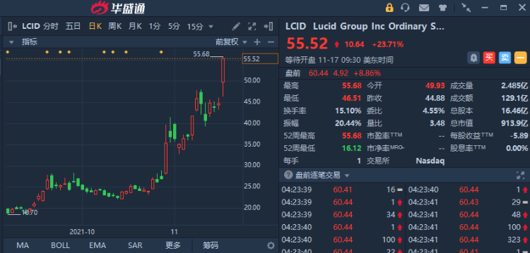 华盛资讯11月17日消息,新能源车制造商Lucid(LCID)盘前涨近9%,昨日收涨超23%。消息面上,公司CEO周二接受采访时表示,公司计划计划在2025年左右在中国和中东建厂。