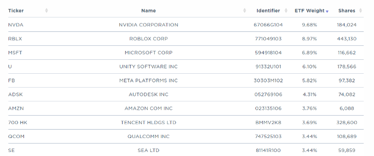 该ETF由专注于创新主题基金的资产管理公司Roundhill Investments(环山投资)在今年6月30日推出,追踪Ball Metaverse Index,囊括了41家与元宇宙相关的公司。前十大成份股包括: