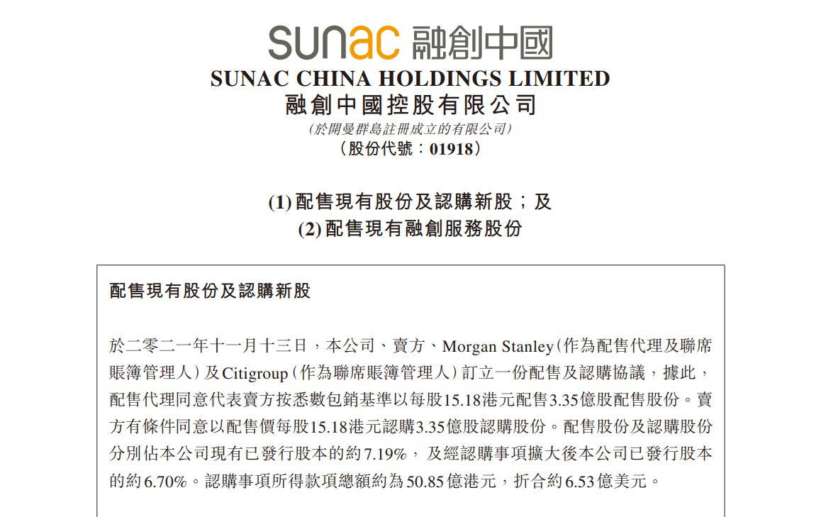 此外,融创中国还表示,于二零二一年十一月十三日,融创服务投资及配售代理订立一份融创服务股份配售协议,据此,配售代理同意按悉数包销基准以每股14.75港元配售1.58亿股融创服务股份。融创服务股份配售事项所得款项总额约为23.31亿港元,折合约2.99亿美元。