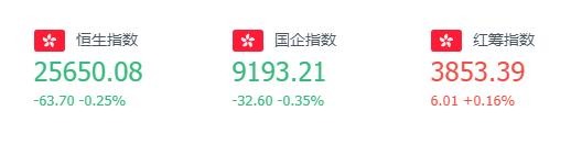 截至周三收盘,恒生指数跌0.25%,报收25650.08点 ,恒生科技指数跌0.60%,报收6672.28。国企指数跌0.35%,报收9193.21;红筹指数涨0.16%,报收3853.39。