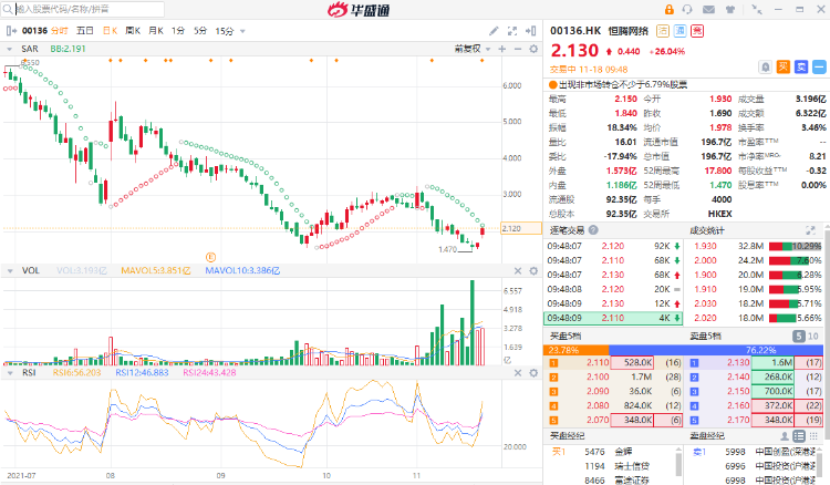 华盛资讯11月18日消息,恒腾网络涨幅扩大至26%,报2.13港元每股,成交额6.322亿港元,最新市值196.7亿港元。此前,中国恒大出售持有的恒腾网络全部股份,总代价21.28亿港元。