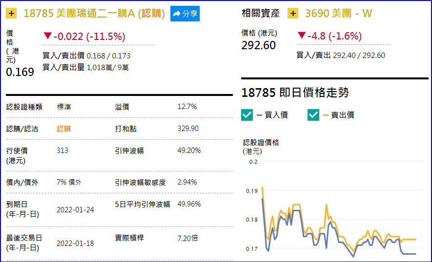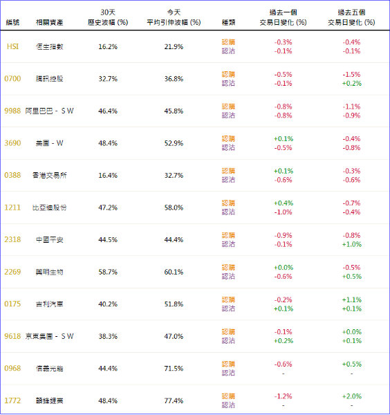 周三恒指相关权证的平均引伸波幅报约21.9%,按日再次小幅下降。个股方面,腾讯控股、阿里巴巴、中国平安相关权证的引伸波幅均有所下调;美团、香港交易所、比亚迪股份等相关认购证的引伸波幅按日调升。