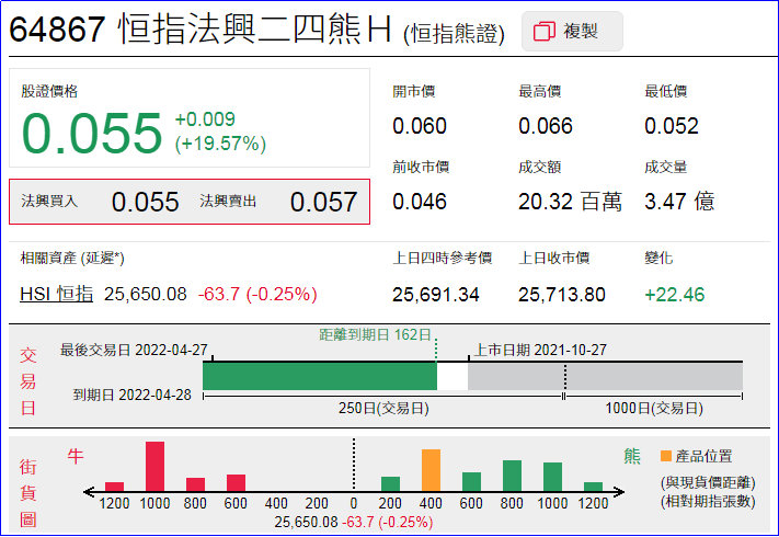 街货分布方面,至周三,恒指牛证街货在收回价24700点至25400点之间,相当约3731张期指合约;恒指熊证街货在收回价25700点至26200点之间,相当约2360张期指合约。
