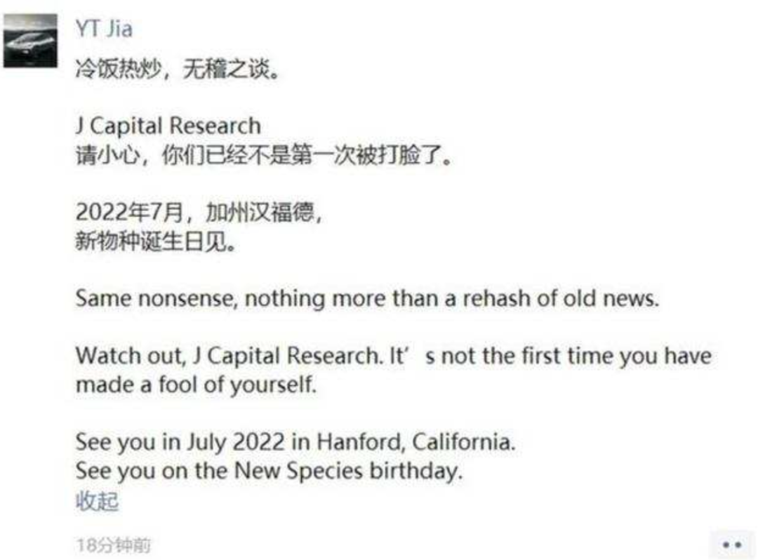 事后,贾跃亭在朋友圈怒斥J Capital的说法是无稽之谈,并且表示“他们已经不是第一次被打脸了。”