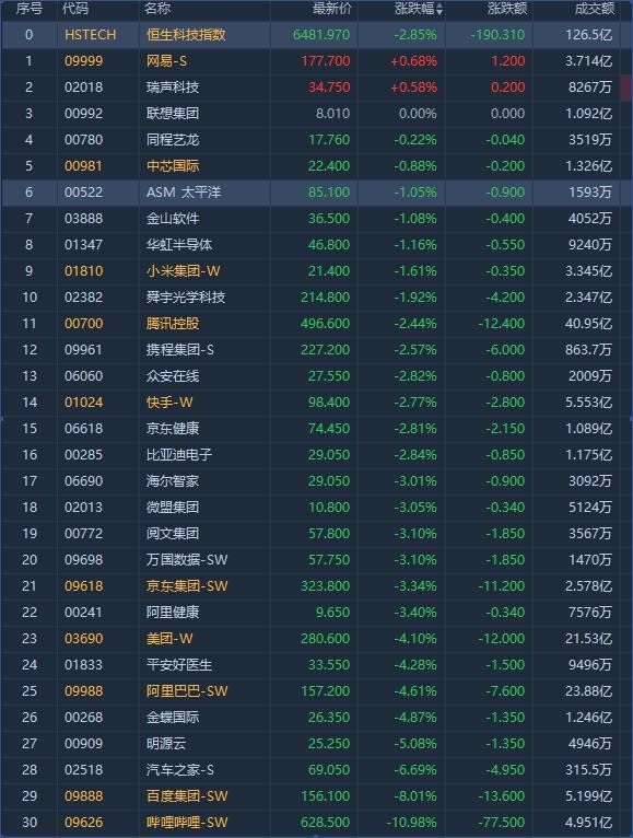 美团、阿里巴巴跌超4%;京东、微盟、万国数据跌超3%;腾讯、快手、阅文集团、携程跌超2%;小米、中芯国际跟跌。