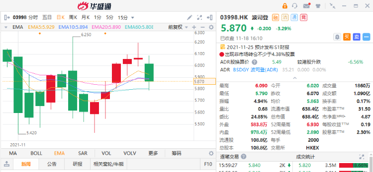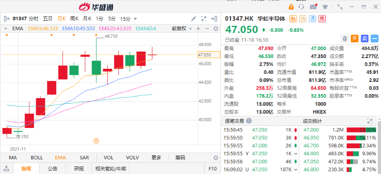 - 麦格理发布研报表示,华虹半导体今年第三季业绩优于预期,其中收入较指引高10%,而27%的毛利率也为指引范围的高位,11%的经营利润率较市场预测的7%为高。此外,华虹指引第四季的毛利率会继续改善,预计为27%-29%,收入则预期按季增长9%,认为集团的产能提升及扩展较该行预期为快,管理层的指引也意味12寸晶圆收入于未来四至五个季度会倍翻。维持华虹半导体“跑赢大市”评级,目标价由67.2港元微升至67.9港元。