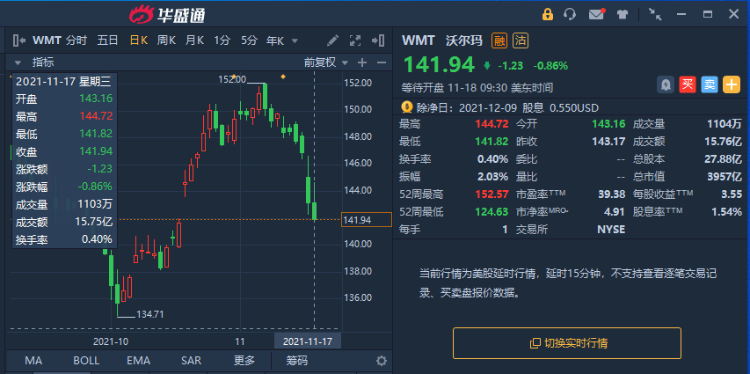 沃尔玛股价周三收盘时下跌0.86%,收于141.94美元。该股在2021年的跌幅仅略低于1%。