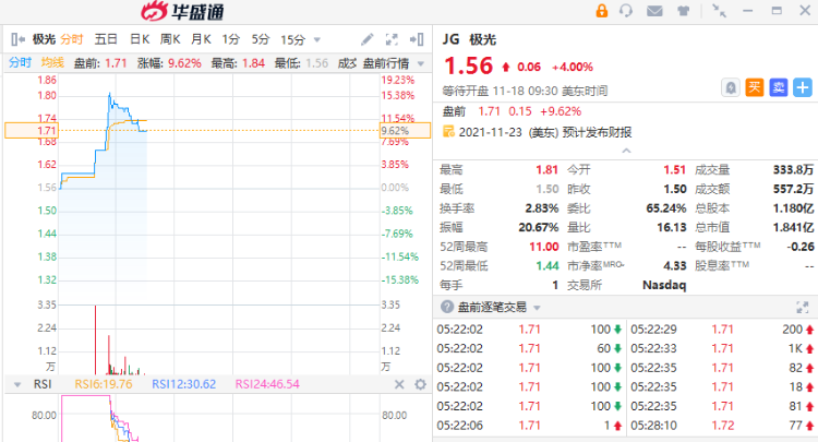 极光(JG)昨日盘中异动,一度上涨20%,最终股价收涨4%。现盘前续涨9.62%,报1.71美元。