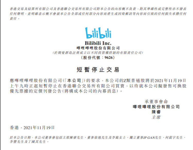 哔哩哔哩港交所公告,本公司的Z类普通股今日上午九时正起短暂停止买卖,以待就本公司拟发售可换股优先票据的定价刊发公告。
