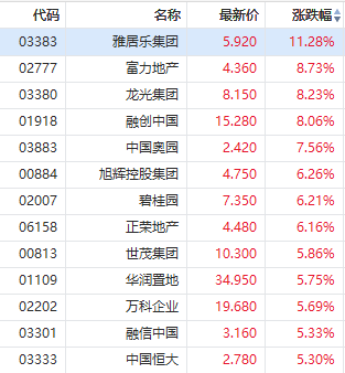 华盛资讯11月19日消息,内房股拉升上涨,雅居乐集团涨超11%,富力地产、龙光集团、融创中国涨超8%,中国奥园涨超7%,碧桂园涨超6%。