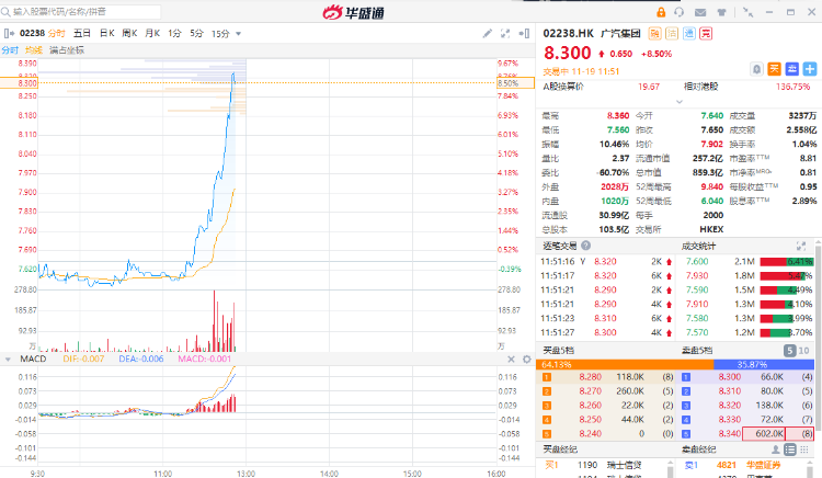 华盛资讯11月19日消息,广汽集团股价拉升涨8.5%,现报8.3港元,成交额2.55亿港元,最新市值859.3亿港元。