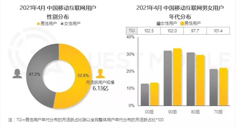 据QuestMobile发布的《2021男性消费洞察报告》显示,截止到2021年4月,中国移动互联网男性用户规模达6.13亿,占比52.8%;男性用户的月人均使用时长超过150小时,高出女性用户20小时。同时,线上消费能力1000元以上的用户已达1.22亿,占比55%。
