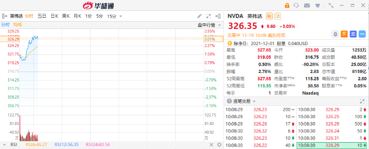 华盛资讯11月19日消息,英伟达(NVDA.US)现涨3.03%,报326.35美元,最高触及327.85美元续刷历史新高。昨日,该股盘中一度创下历史新高327.6美元,最终收涨8.25%。