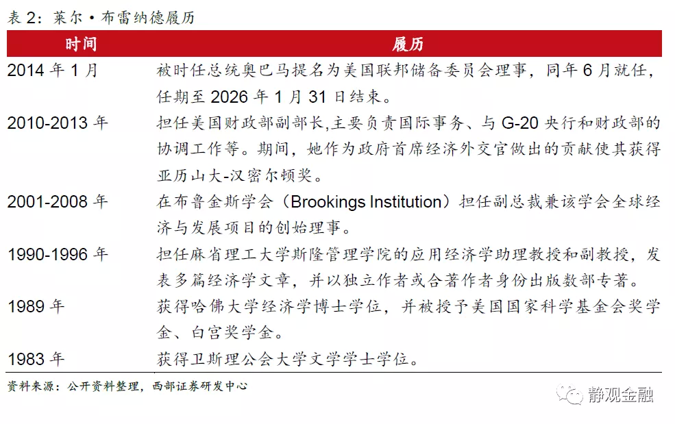 莱尔·布雷纳德,民主党,现年59岁。2014年1月,布雷纳德被时任美国总统奥巴马提名为美国联邦储备委员会理事,同年6月就任。在入职美联储理事会之前,布雷纳德曾于2010年至2013年担任美国财政部副部长,负责国际事务。布雷纳德作为哈佛大学经济学博士,并且曾经担任布鲁金斯学会副总裁、麻省理工学院的应用经济学副教授,具备更扎实丰厚的经济学学术研究背景,与鲍威尔法学出身、投行、私募的工作背景具有明显区别。