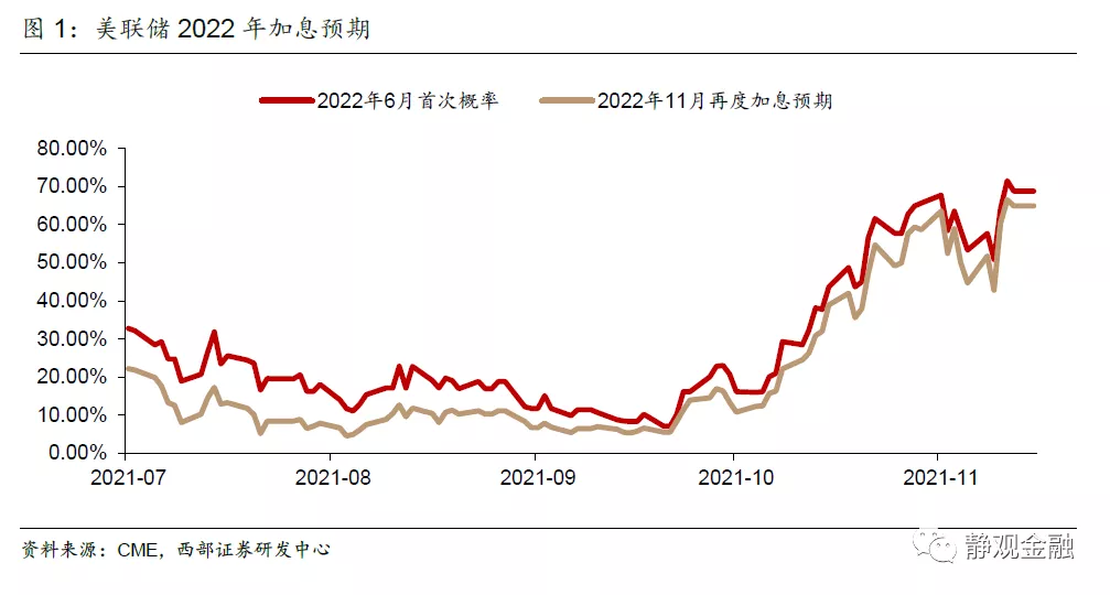 也就是说,中期选举与大选前10年期美债收益率大概率回落或为美联储货币政策鸽派的结果。那么对于市场来说明年或许有个极为关键的预期差:加息或晚于市场预期;加息次数亦将少于市场预期。如图1所示,根据CME期货交易数据,市场预计明年6月美联储落地疫后首次靴子的概率已经超过60%,且市场普遍预计明年11月二次加息亦为大概率。基于前文,我们认为美联储最早的首次加息时间或为明年中期选举后的12月。