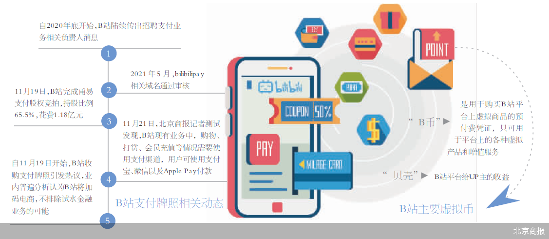 似乎每个互联网巨头都有个“支付梦”。11月21日,北京商报记者注意到,视频平台哔哩哔哩(也称“B站”)通过收购的方式曲线获得支付牌照一事引发热议,在招聘相关工作人员、申请域名过后,B站的支付业务取得实质性进展。B站的主体运营公司——上海宽娱数码科技有限公司,于11月19日以接近1.18亿元的价格,完成了对浙江甬易电子支付有限公司(以下简称“甬易支付”)65.5%股权的竞拍工作。拿下互联网支付牌照的B站,又将如何进军下一城?