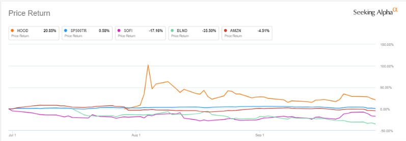 个股表现方面,在第三季度,Robinhood表现优于标普500指数,而亚马逊、SoFi Technologies和Blend Labs均落后于整体指数。