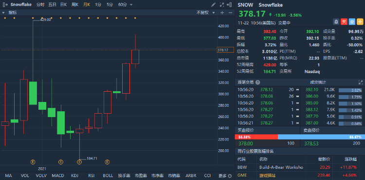 2020年9月,伯克希尔·哈撒韦又罕见地在IPO阶段参与打新,购入云计算公司Snowflake。这家公司的估值早已经远远超过巴菲特日常考虑的范畴,但商业模式又非常符合其对企业内在价值的追求。上市之后一年多的时间里,这家公司因为消化高估值反复震荡,近期突破千亿美元;