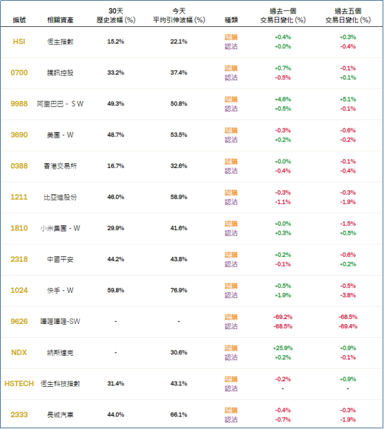 上周五恒指相关权证的平均引伸波幅报约22.1%。个股方面,哔哩哔哩相关认购证及认沽证的引申波幅均出现大幅调降,纳斯达克相关认购证的引申波幅亦大幅调升。