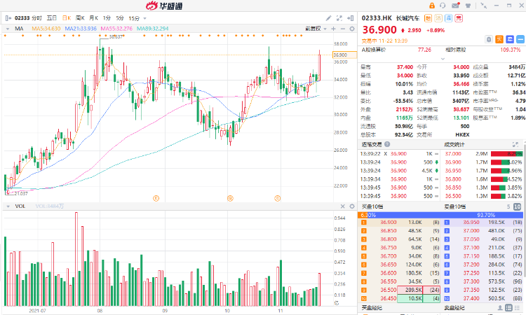 中金发表报告表示,上周五参观了长城汽车旗下各品牌展位及新品发布会,维持其跑赢大市评级及目标价45港元,相当预测22年市盈率28倍。截至发稿,长城汽车大幅上涨近9%,报36.9港元。