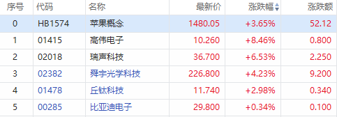 苹果产业链集体爆发,高伟电子涨超8%,京东方精电涨超6%,瑞声科技涨6%,舜宇光学涨超4%。