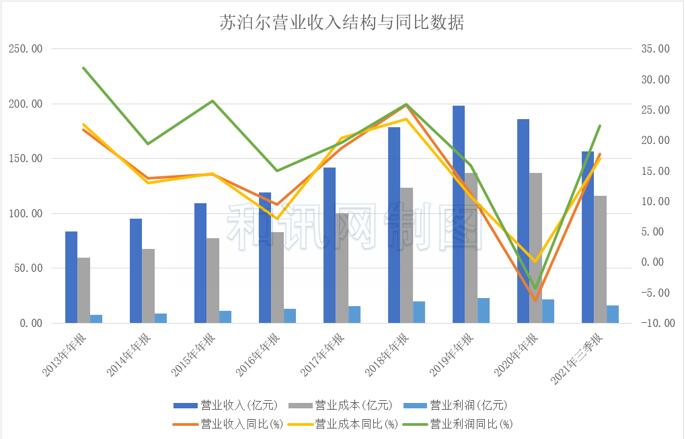 数据显示,2017-2020年以及2021年1-9月,苏泊尔的营业收入同比增速分别为18.75%、25.83%、11.22%、-6.33%以及17.74%。