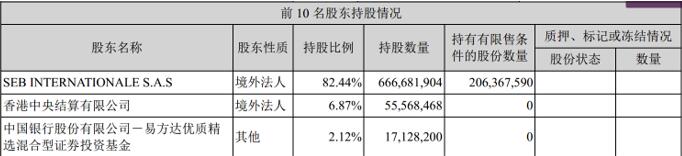 在随后几年里,苏泊尔集团有限公司逐步的减持、转让股份。到了2016年,SEB集团以人民币29元/股的价格,买下了第二大股东苏泊尔集团有限公司所持有的5,000万股无限售流通股份。