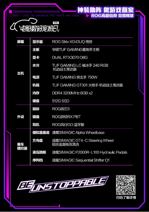华硕重炮手主板和华硕DUAL RTX 3070 O8G显卡为整机提供了性能支持,43英寸白色特别版ROG STRIX XG43UQ绝势电竞显示器,也为玩家们带来了更宽广、真实的赛车游戏画面。再加上TUF GAMING突击手750W电源、TUF GAMING GT301火枪手 机动战士高达版机箱的稳定支持,ROG赛车模拟器主机的性能得到充分输出,而ROG战刃3鼠标、ROG游侠RX PBT键盘、ROG风行GO蓝牙版耳机等外设也给玩家带去了好的体验。
