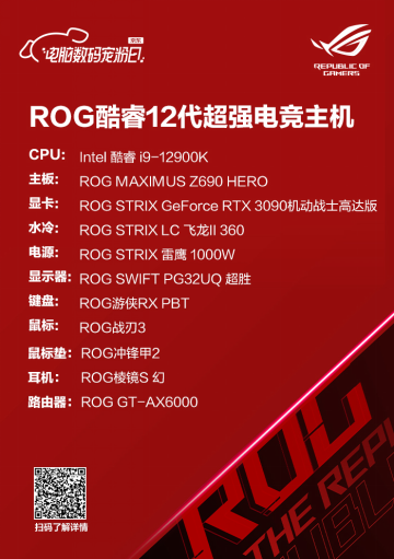 黑色主题的ROG酷睿第12代电竞主机则搭载了当下intel旗舰酷睿i9 12900K,以ROG MAXIMUS Z690 HERO为核心,承继ROG玩家国度DNA优异基因,低调奢华的外观之下蕴藏硬核性能。