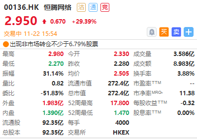恒腾网络尾盘涨幅扩大至29% 中国恒大此前清仓恒腾网络股份