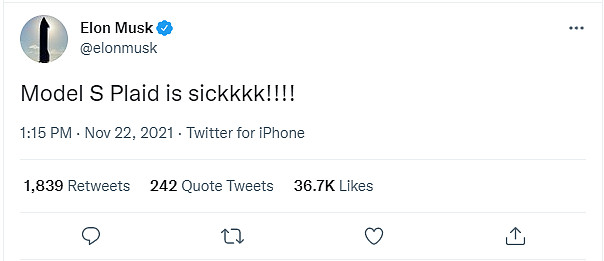 马斯克在社交平台表示,Model S Plaid 太酷了!有网友猜测该车型可能升级了FSD Beta V10.5。也有网友猜测Model S的外观可能会有调整,因为该车型已经多年未变。另有网友猜测,也可能是百里加速时间或更加缩短。