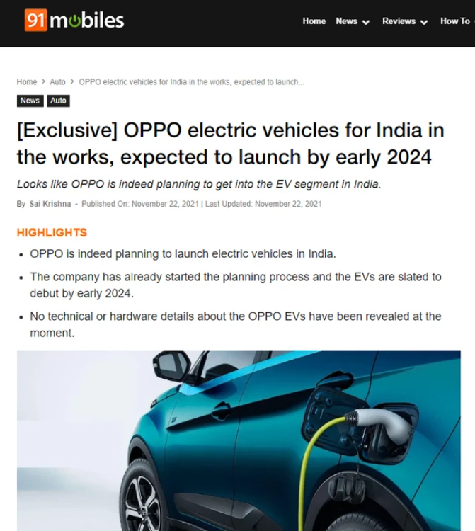 印媒:OPPO计划2024年初在印度推出首款电动汽车