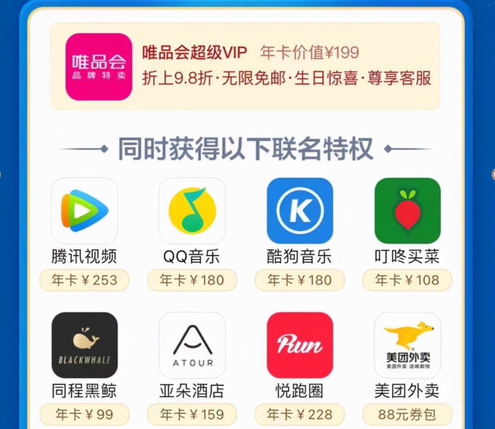 我们可以算一笔帐,唯品会超级VIP总价只需168,但它里面却包含着:腾讯视频年卡、QQ音乐年卡、美团券包等其余八种APP的超级特权,总价近1500元。