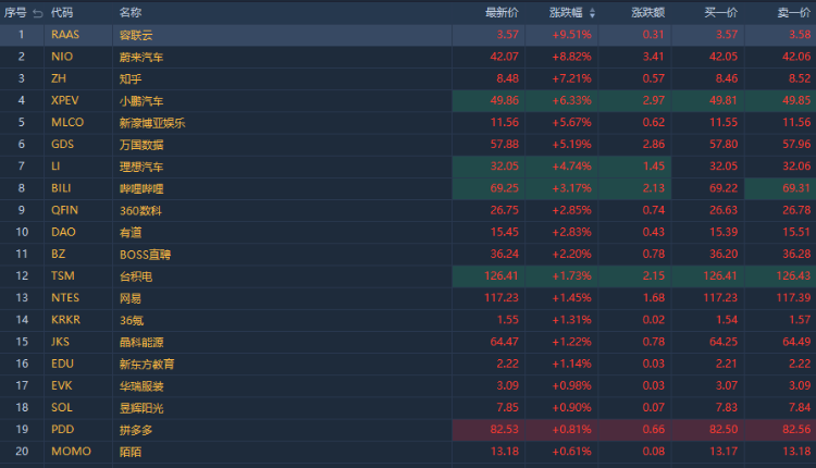 容联云 $RAAS 涨9.51%,知乎 $ZH 涨7.21%,万国数据 $GDS 涨5.19%,有道 $DAO 涨2.83%,新东方教育 $EDU 涨1.14%。