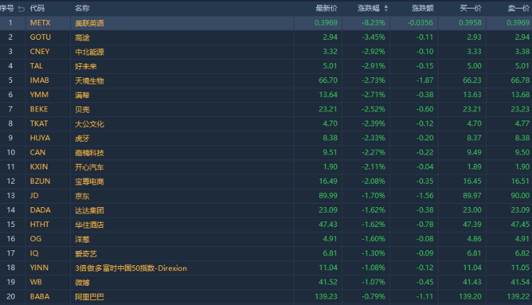 美联英语 $METX 跌8.23%,高途 $GOTU 跌3.45%,好未来 $TAL 跌2.91%,嘉楠科技 $CAN 跌2.27%,京东 $JD 跌1.70%,洋葱 $OG 跌1.60%。