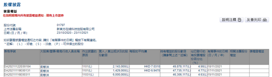 根据联交所最新权益披露资料显示,2021年11月18日,新东方在线(01797.HK)获非执行董事兼主席俞敏洪在场内以每股均价7.031港元增持214.3万股,涉资约1506.74万港元。增持后,俞敏洪最新持股数目为49,878,117股,持股比例由4.77%上升至4.98%。在17日,俞敏洪就已增持142.9万股新东方在线。