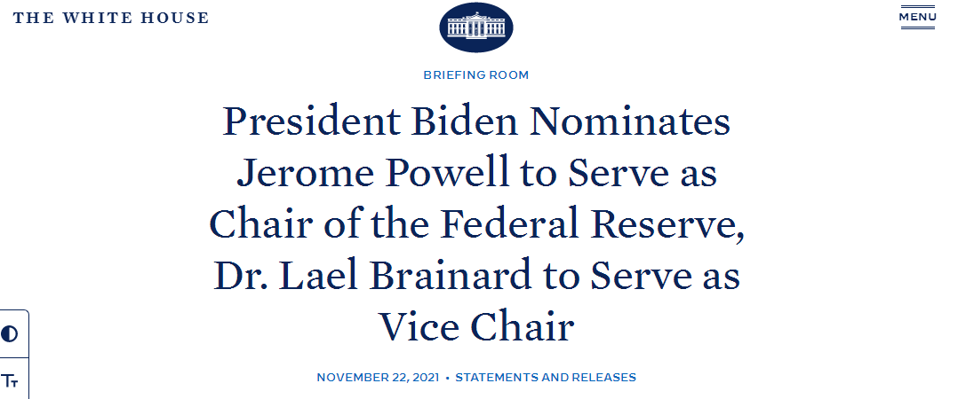 美东时间22日早上九点,白宫在官网发表声明,总统提名现美联储主席鲍威尔(Jerome Powell)连任美联储主席,另一位候选人、现美联储理事布莱纳德(Lael Brainard)将升任美联储副主席。