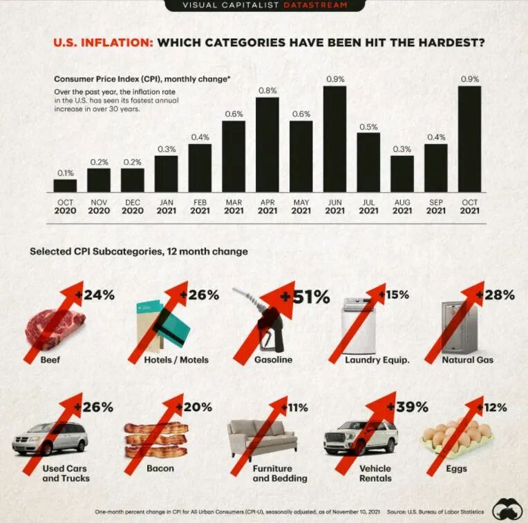 细分来看,2021年,让美国消费者感受到“切肤之痛”的涨价领域分别是: