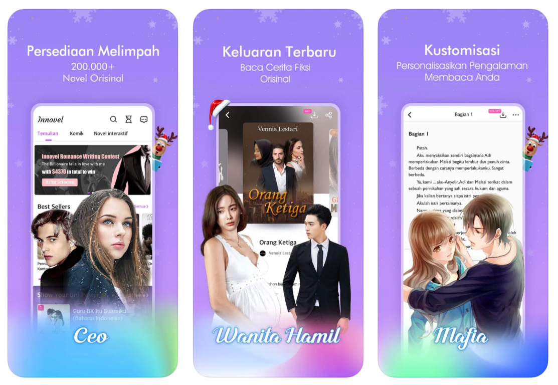 星阅互娱旗下的 Novelme、Novelstar、Novelaku 三款产品也主攻东南亚市场,“从建立开始就是完完全全的印尼本土化平台”。但它们在产品设计思路上又不完全一样,Novelme、Novelstar 为原创内容平台,Novelaku 则为内容分发平台,从外部收购版权,但作品都出自印尼作者。
