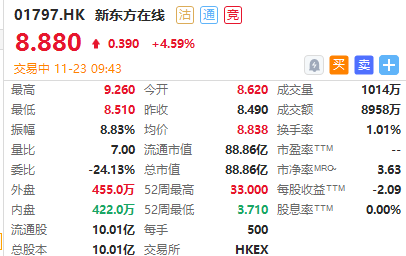华盛资讯11月22日消息,新东方在线涨4.59%,新东方涨3%,新东方在线再获俞敏洪增持214.3万股,两日增持的金额达到了2500万港元